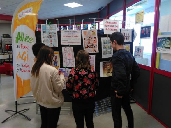 Installé dans le CDI du collège, le studio a permis aux jeunes de s'exprimer librement et de manière courte sur le vivre ensemble. A partir d'images extraites de la presse, de caricatures, de pubs, les jeunes avaient 1 minute pour exprimer leur réaction au micro du studio.